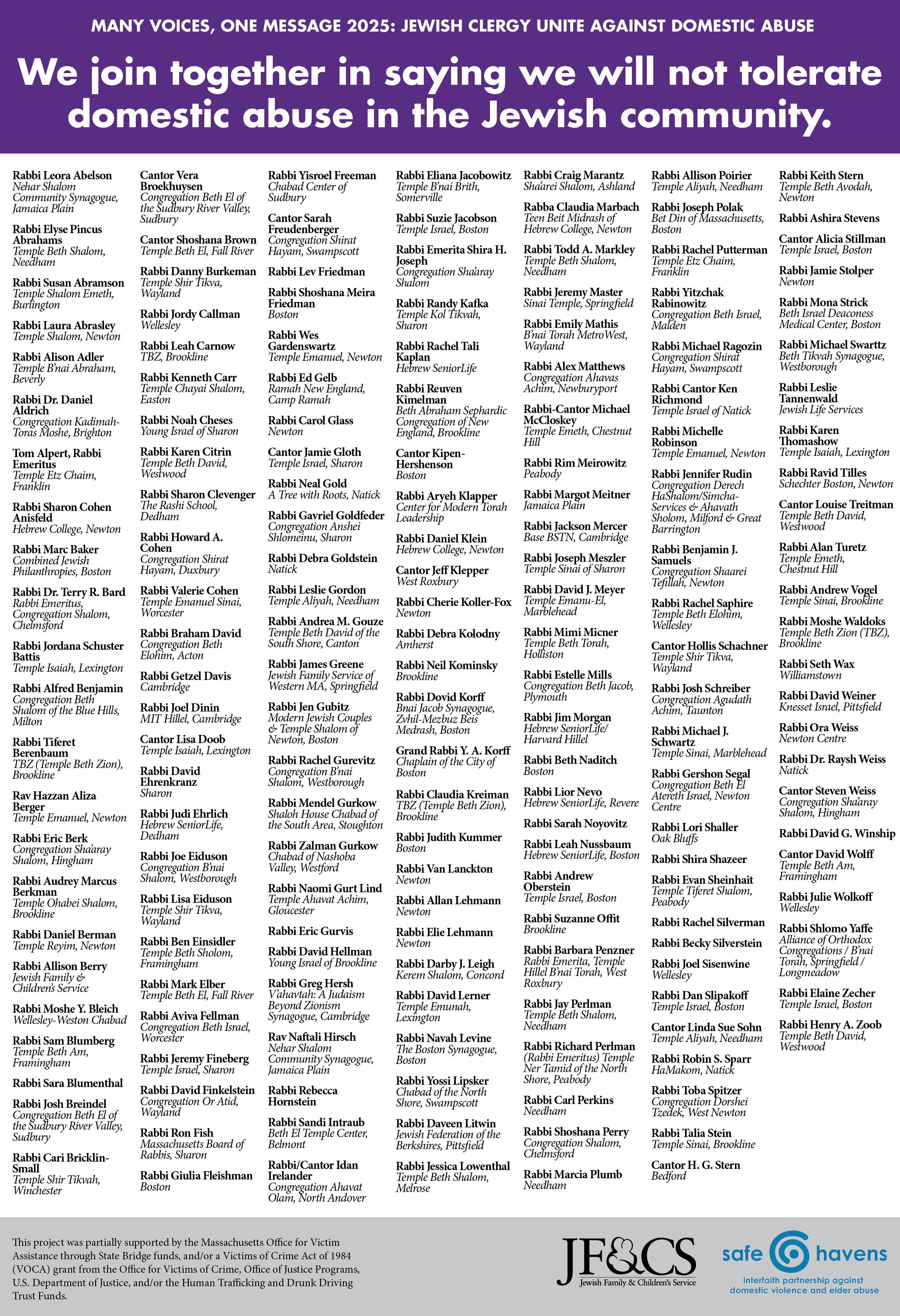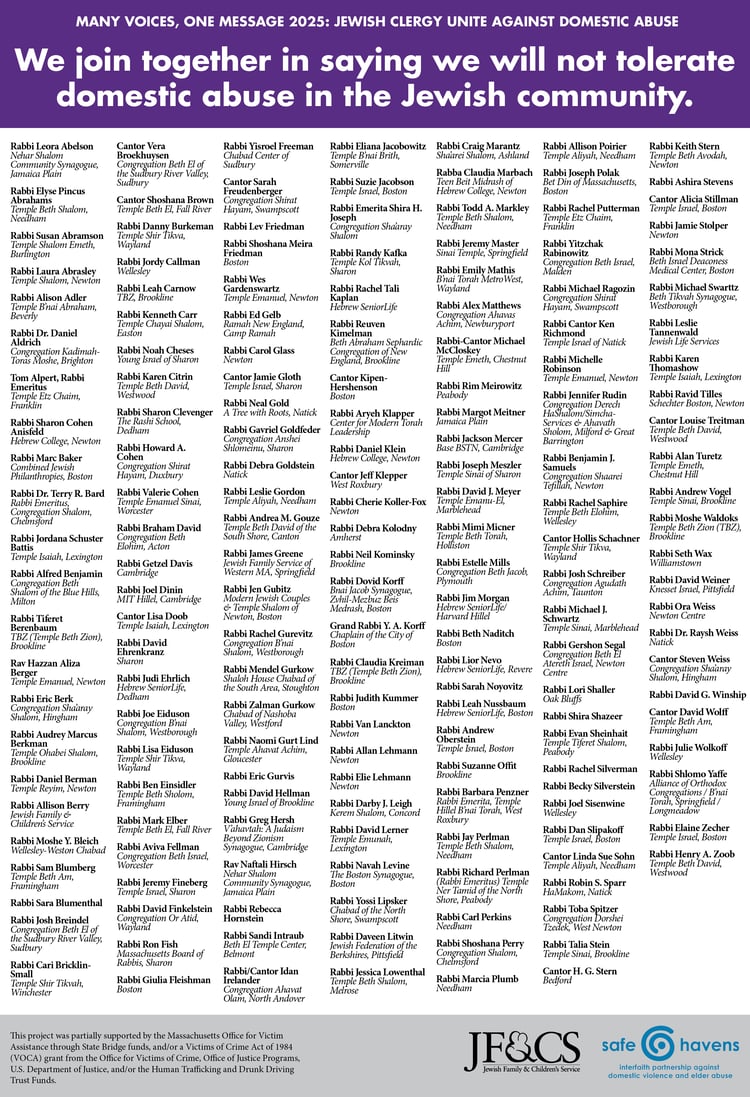 As part of our Journey to Safety program, we work with clergy in the Jewish community to stand against domestic abuse. Here are the clergy who signed on to our most recent campaign.